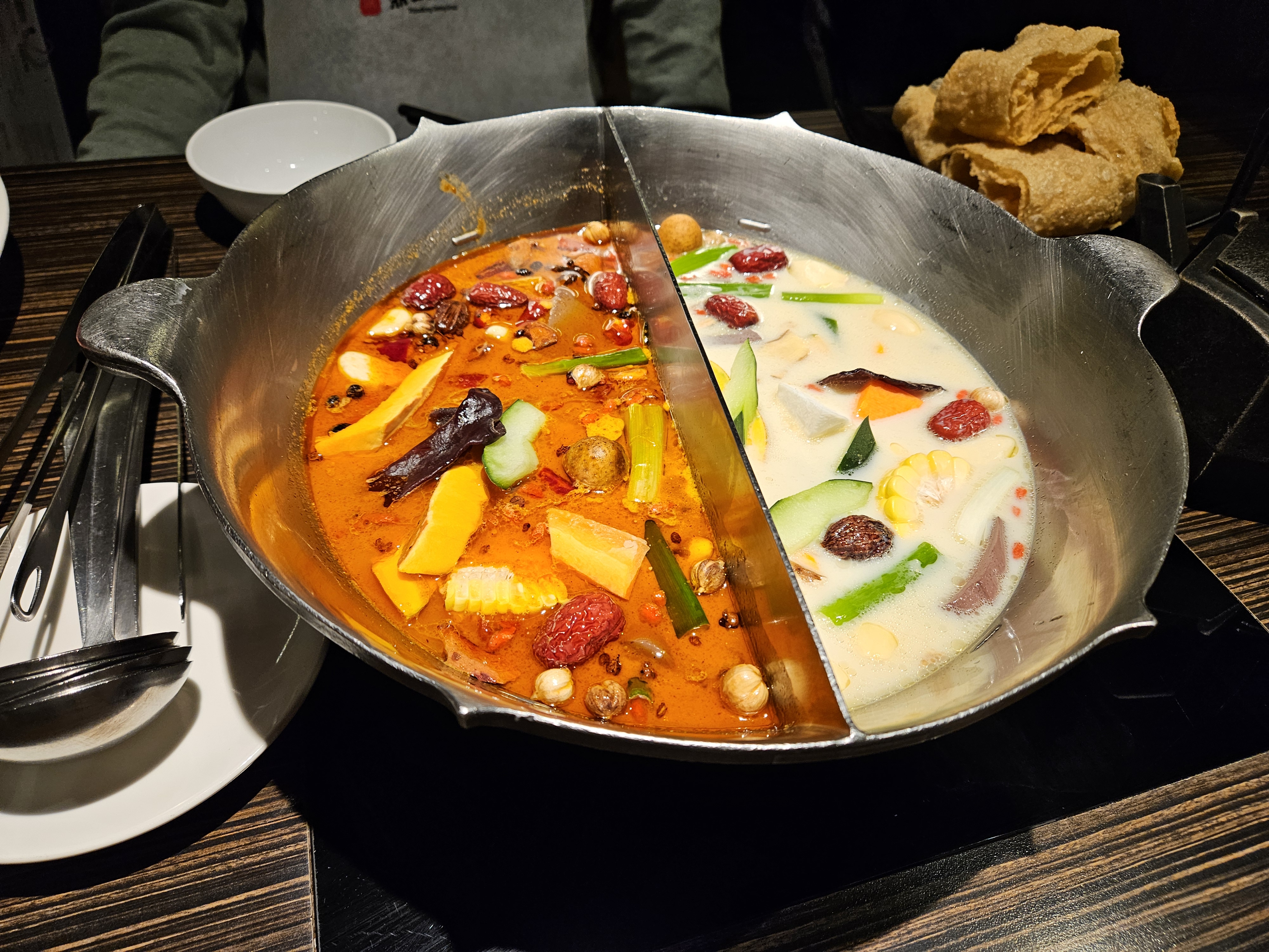 - 대기 5분 정도하고 들어갔다. 내부 시설이 굉장히 깨끗했다. 좌석의 메뉴는 QR 로 주문하도록 되어 있었다. 훠궈에는 선지 같은게 들어있었는데 찾아보니 오리 선지였다 (처음 먹어봄. 소보다는 탱글탱글한 느낌?). 원래 훠궈에는 기본적으로 많이 먹는 음식이라고 한다. 백탕, 홍탕 둘다 괜찮았던 것 같다. 마라 훠궈는 아니고 토마토탕이랑 우유탕 느낌의 퓨전 훠궈? 라고 해야될까? 확실히, 부모님도 드시기에는 괜찮았다. 셀프 바에서 밥이랑 소스는 직접 가져올 수 있는데, 저 백탕에 밥 말아먹는 것도 맛있었다. 잘 어울리는 듯? 배불리 먹고 나니 3명이서 10만원 조금 넘게 나왔다